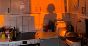 Quando o sol baixa, ele projeta as sombras dos objetos de forma alongada. A grade da janela vira uma estampa listrada na parede. A cadeira da sala projeta formas abstratas no tapete. O vapor do café ganha corpo contra um fundo escuro.