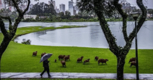 Em vez de pegar estrada até o litoral, decidimos tomar um café quentinho na varanda. Coloquei meu biquíni em cima da cadeira e troquei para um shorts confortável e camiseta larga (prendi o cabelo num coque despretensioso). Colocamos um casaco por cima e fomos de bicicleta até um parque pertinho de casa. Quando chegamos, as árvores enormes brilhavam de chuva, as folhas estavam verdinhas molhadas, e até um arco-íris tímido apareceu entre as nuvens. As flores amarelas do jardim soltavam um cheirinho doce no ar, e passarinhos cantavam uma trilha sonora só nossa.