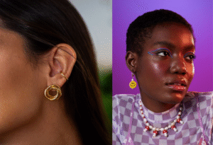 • Ear cuffs discretos: São aquela tendência de brinco que “abraça” a orelha sem precisar de segundo furo. Se achar ousado demais, escolha modelos pequenos e neutros (prata ou dourado) para começar.