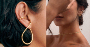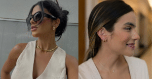 Por fim, não podia deixar de mencionar o luxo silencioso, o quiet luxury. Para quem prefere um toque mais clássico e atemporal, vale investir em peças discretas: correntes finas, pedras delicadas, designs limpos. Uma correntinha de ouro com pingente simples, um brinco de pérola pequeno ou uma pulseira delicada combinam com tudo e duram para sempre, além de transmitirem elegância tranquila.