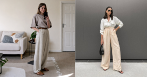 Dica prática: Para evitar que o look pareça de pijama, use a pantalona com cintura alta. Assim a calça fica no lugar, define a cintura e não dá aquela impressão de que está sobrando pano. Eu gosto de combinar com uma blusinha para dentro (pode ser a mesma regatinha do truque 1 ou uma t-shirt leve) para reforçar a silhueta. Tecidos como linho, viscose ou algodão bem fininho são ideais. E preste atenção: se quando você caminha sente um ventinho nas pernas, pode comemorar: acertou na medida certa.