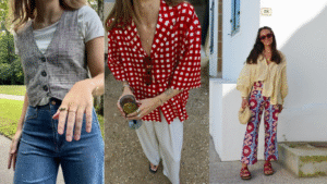 Brinque com texturas e estampas simples: Acho legal misturar cores também por estampas leves. Um xadrez discreto com vermelho, ou uma blusa floral com verde claro, podem ser suaves o bastante para começar, mas já introduzem várias cores no visual. Ou experimente texturas diferentes: tricô laranja, seda lavanda, jeans azul – tudo junto forma um visual interessante e cheio de vida, sem serem cores chapadas tão fortes.