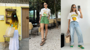 Mas não vai ser só marrom não: 2025 pede alegria no armário. Amarelo manteiga, rosa suave e até um laranja tangerina aparecem com tudo. Imagina uma camiseta amarelo-claro com calça branca de linho – puro frescor! Use essas cores vibrantes com peças neutras (branco, bege ou jeans) para equilibrar. E verde-limão e azul-bebê também aparecem com força nas estampas tropicais, trazendo toda a energia brasileira. Eu, por exemplo, estou doida para usar um vestido rosa quartzo com tênis branco – fica uma graça e levanta qualquer visual!