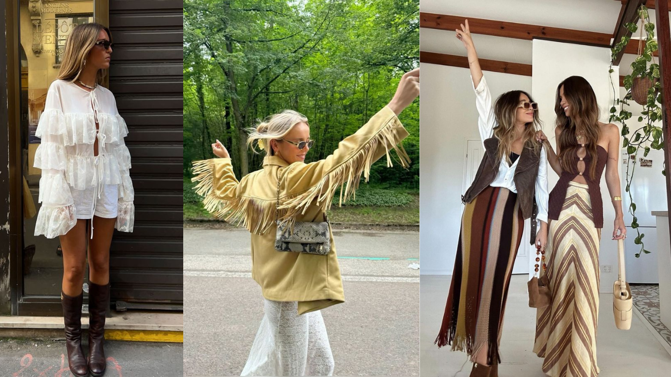 Boho Chic e Franjas. O estilo boêmio volta com força total, especialmente nas estações mais quentes. Vestidos longos fluídos, saias rodadas, blusas de manga ampla e kimonos estampados vão dominar looks mais descontraídos. Franjas aparecem em casacos, bolsas e batas, dando aquele movimento charmoso – ótimo para um visual de fim de semana ou festival. Por exemplo, um vestido floral longo + cinto fino + bota de camurça e chapéu de palha já é uma combinação boho perfeita para um passeio de sábado. E o mais legal é que você se sente super confiante e pronta para arrasar com um look desses!