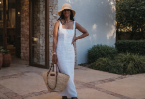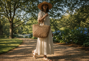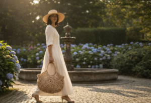 3. O Contraste de Tecidos: Onde a palha brilha de verdade é no contraste. Eu amo usar uma bolsa de tramas naturais com uma camisa de linho branca impecável e um jeans clássico. Ou então, com um vestido de seda. A textura rústica da palha “quebra” a seriedade dos tecidos nobres, criando um visual que diz: “eu me arrumei, mas não estou tentando demais”.