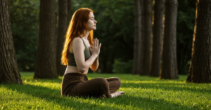 Então decidi meditar de verdade. Cruzei as pernas na canga, mantive as costas eretas e coloquei as mãos no colo, palmas viradas para cima — num gesto de entrega. Fechei os olhos e levei toda a atenção para a respiração. Inspirei contando até quatro, senti o ar fresco enchendo a barriga, e depois soltei lentamente também contando até quatro, como se soltasse cada preocupação com cada expiração. Logo no começo, muitos pensamentos rodavam na minha mente feito nuvens dispersas no céu: a sala de aula, a planilha de trabalho, a voz da Alice falando comigo.