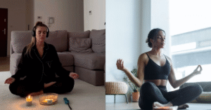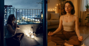 • Prepare um cantinho zen: Crie um espaço tranquilo em casa. Tire móveis e objetos do caminho para ter espaço. Desligue as notificações do celular e acenda uma luz suave ou vela se quiser. Coloque uma música calma de fundo. Eu uso um tapete ou toalha grossa no chão e, às vezes, incensos delicados. O importante é eliminar distrações – quando praticar, que seja só você e seu tapete. Uma almofada extra próxima também cai bem para apoiar o corpo em algumas posturas.