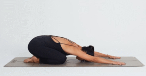 1. Postura da criança (Balasana): Ajoelhe-se e sente sobre os calcanhares, abrindo os joelhos para frente. Abaixe o tronco até a testa encostar no chão e estenda os braços à frente (ou deixe-os descansar ao lado do corpo). Inspire e expire lentamente ali dentro. Essa posição é um abraço gostoso na coluna: sinto todo o peso do dia ir embora. Eu costumo ficar aí por 5 ou 6 respirações profundas. Sempre sinto os ombros e a lombar relaxarem profundamente.