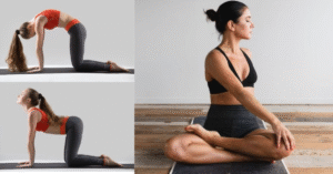 2. Gato e Vaca (Marjaryasana e Bitilasana): Volte para a posição de quatro apoios. Ao expirar, arredonde as costas para cima (o “gato”) e olhe levemente para o umbigo. Ao inspirar, faça o movimento contrário (a “vaca”): abaixe o abdômen em direção ao chão e levante o peito, olhando para frente. Repita esse ciclo 5 vezes, sempre coordenando com a respiração. Esse vai-e-vem “lubrifica” toda a coluna e aumenta a mobilidade. A cada vez que estou no gato ou na vaca, sinto a coluna inteira se mover de forma suave. É ótimo para “destravar” as costas depois de ficar muito tempo sentada.