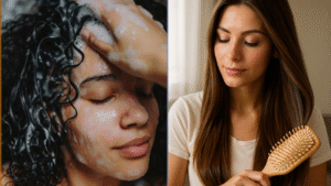 Pentear com amor e moderação: Eu costumava escovar demais e com pressa, o que irritava o couro cabeludo e deixava o cabelo quebradiço. Agora penteio meu cabelo quando está molhado, com um pente de dentes largos e um creme desembaraçante natural. Se precisar usar escova, aplico antes um protetor natural (por exemplo, borrifar água com algumas gotinhas de óleo) para domar o frizz. Descobri que escovar com calma e carinho, começando pelas pontas e subindo, deixa tudo mais suave e reduz bastante a quebra.