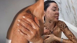 Outro passo importante foi incorporar esfoliações caseiras suaves na rotina. Isso ajuda a remover células mortas e deixar a pele renovada, o que por sua vez melhora o aspecto das estrias. Uma vez por semana eu fazia esfoliação com borras de café misturadas a um óleo ou mel (como ensinam receitas caseiras). O café é ótimo porque tem propriedades antioxidantes e emolientes, deixando a pele bem macia após o enxágue. Além disso, a textura granulada ajuda a esfoliar sem agredir demais. Eu fazia movimentos circulares leves sobre as estrias (região das coxas e do quadril) e sempre lavava em seguida. É muito simples de fazer e o cheirinho de café ainda deixa o dia mais gostoso!