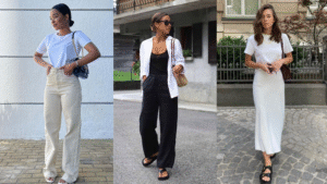 Base neutra: monte o look principal com neutros (como uma blusa branca + calça jeans azul escuro). Isso garante versatilidade.