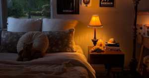 Instale uma lâmpada inteligente ou apenas um abajur com cúpula de tecido que deixe a luz suave. O objetivo é que, ao entrar no quarto, seus olhos relaxem instantaneamente, sem precisar de esforço para focar em detalhes nítidos.