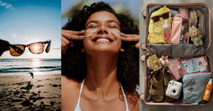 Meu primeiro item sagrado é o protetor solar. Sempre repito: nem pense em sair de casa sem ele, especialmente neste verão! Na rotina diária a gente escuta isso, mas vale duplicar a atenção nas férias ao sol. Como lembrou um portal de lifestyle, “o protetor é fundamental para quem ama tomar sol” e o ideal é aplicar antes de sair e retocar ao longo do dia. Eu tenho um queridinho em tubo pequeno para viagem, bem compacto, SPF 50 – proteção máxima! Carrego na bolsa e reaplico cada vez que sinto na pele que o sol tá pegando mais.