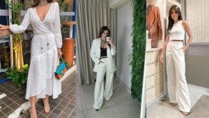 All White (Branco Total): Use roupas brancas em diferentes texturas. Por exemplo, camisetinha de algodão + calça branca fluida + sandália nude. O branco natural da roupa irradia frescor e confiança, além de sempre chamar atenção pela elegância. É perfeito para dias de calor ou ocasiões que pedem algo leve e chique.