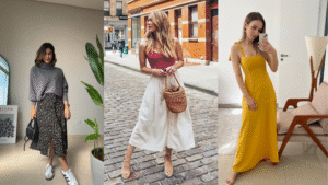 Para vibrar alto, invista em itens-chave que valorizem o seu corpo e reflitam seu estilo. Por exemplo, um blazer estruturado é quase um uniforme de poder: usado com jeans ou calça de alfaiataria, ele levanta qualquer produção. O blazer no corte certo (cinturado ou levemente oversized, de acordo com você) transmite imediatamente confiança. Da mesma forma, calças de alfaiataria ou uma saia midi fluida alongam a silhueta com elegância e garantem um ar sofisticado ao visual. O vestido envelope (transpassado) também é um coringa: ele marca a cintura de forma certeira e se ajusta ao corpo, conferindo feminilidade e segurança. Em um instante, ele se transforma em um look completo e poderoso.
