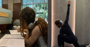 3. Tarde: Pauso um pouco para almoçar algo saudável e, depois, reviso o que foi feito pela manhã. Se tiver uma aula online ou leitura, faço nesse momento. Faço alongamentos rápidos de 15 minutos se sentir cansaço.