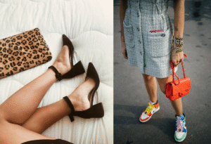 Sapatos baixos confortáveis: Deixe os saltos finos guardados no armário. Aposte em sapatilhas, sandálias rasteiras de tiras finas, papetes estilosas, plataformas de cortiça ou espadrilles. Esses modelos andam em alta e suportam o dia inteiro de pé. Mary Janes (tipo boneca), tênis casuais e até sandálias esportivas (papetes) são super bem-vindos – a ideia é aliar conforto e estilo. Um tênis branco, por exemplo, vai com tudo e transforma um vestidinho simples em look cool. Se quiser um pouco de salto, prefira o salto bloco grosso (mais estável) ou anabela de palha, que são mais fáceis de usar.