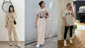 Look 2: Conjunto de Moletom + Tênis – Calça de moletom bege claro, cintura alta com elástico, junto com um moletom combinando (não muito largo, mas confortável). Para dar uma modelada no visual, coloque a blusa de moletom por dentro da calça na frente e um cinto fino. Finalize com um tênis branco simples. Para um toque feminino extra, use um colarzinho delicado por cima do moletom. Esse combo é puro conforto, mas a cor clara e o acessório deixam com cara de capricho.