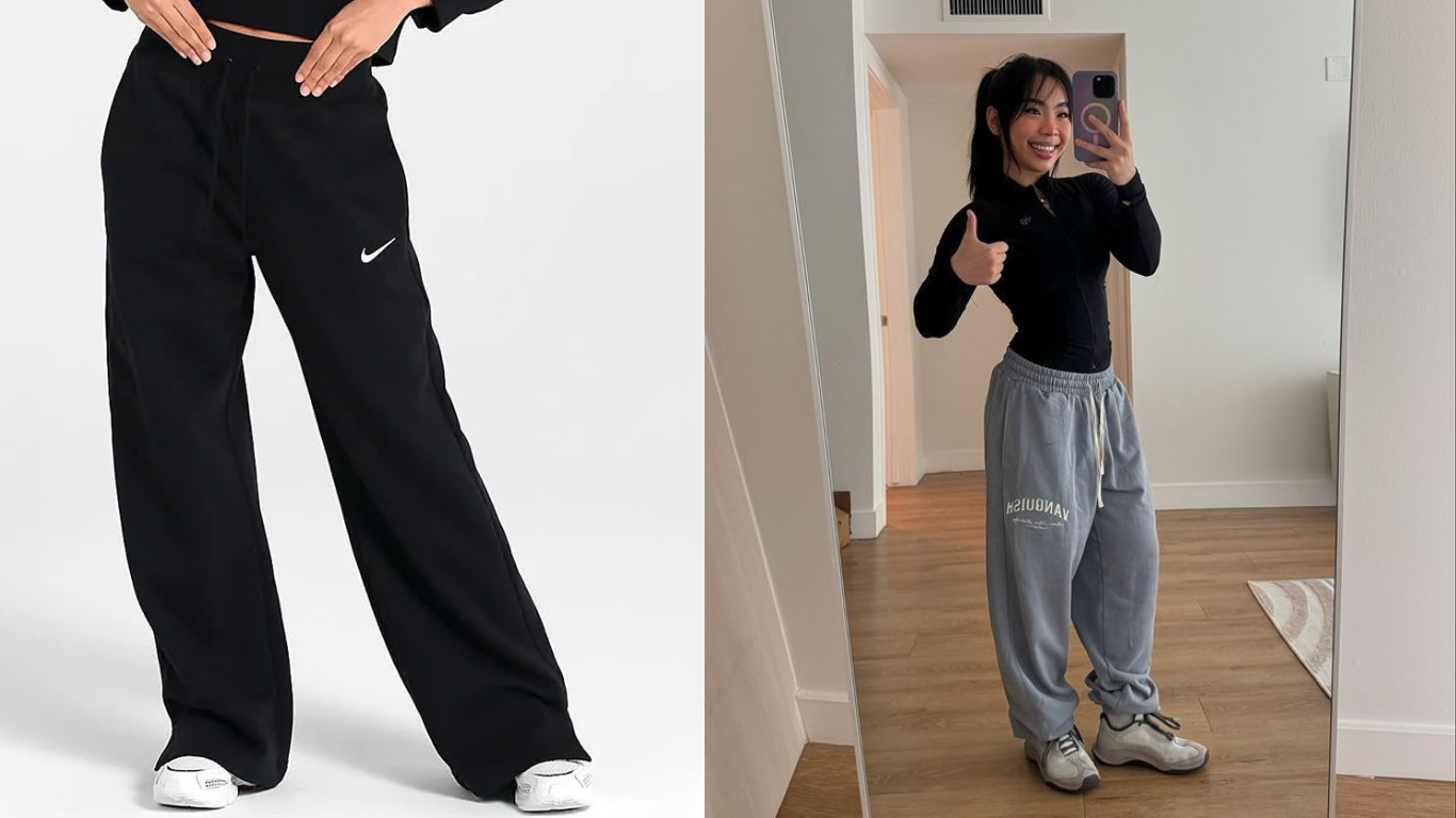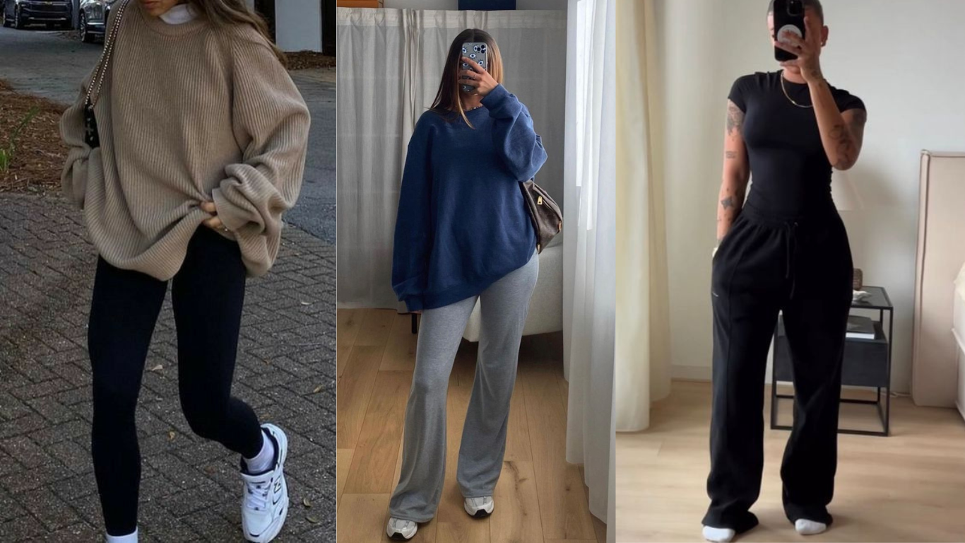 • Look todo neutro: calça moletom cinza médio + camiseta preta larga + casaco cinza claro. Simples e elegante: ótimo para pilates, yoga ou uma caminhada leve. A calça moletom (ou jogging slim) oferece o máximo conforto. O segredo é brincar com diferentes tons de cinza e preto para deixar tudo harmônico, adicionando um tênis discreto para completar.