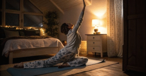 Te confesso um momento que nunca esqueço: era uma madrugada chuvosa de outono. Eu estava deitada, já com saudade da cama, quando lembrei do meu ritual de alongar antes de dormir. Levantei meio sonolenta, peguei o celular e coloquei um pagode instrumental bem calmo. Abri a janela só um pouquinho para sentir o barulho da chuva caindo lá fora. Enquanto me espreguiçava de olhos fechados, sentia o cheiro fresco da chuva entrar no quarto e uma brisa leve bater na minha cara. Foi um momento tão mágico — o som da chuva e daquela música tranquila me faziam esquecer do cansaço. Eu terminei o alongamento sorrindo, me sentindo renovada e serena.