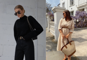 Outra dica de estilo é brincar de combinar texturas. Um suéter caramelo de lã fica lindo com uma saia marrom de couro sintético ou veludo. Uma calça verde-oliva com uma blusa de seda azul-marinho (sim, azul-marinho entra como neutro também) rende um look sofisticado e fácil de montar. Não tenha medo de contrastes suaves: mostarda + cinza escuro, creme + marrons, bordô + azul-escuro… o céu é o limite, e essas misturas ainda refletem o clima da estação.