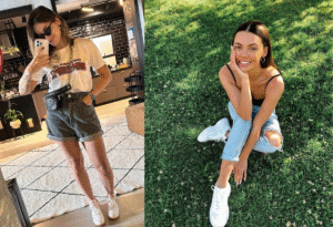 E não pense que tênis serve só para calça ou vestido. Um short jeans cintura alta + camiseta graphic + tênis é a cara do fim de semana descontraído. Ou uma calça jogger com top soltinho + tênis pode ser ótimo para dias de compras na cidade. O mundo dos looks com tênis é enorme! Aliás, o próprio blog sugere até ideias para o jantar ou balada: modelos com brilho, metalizados ou detalhes street podem deixar o look noturno estiloso (eu ainda prefiro guardar meu tênis só para o dia a dia, mas vale a inspiração).
