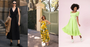 Look 2 – Visual alegre de quinta-feira: Digamos que você escolha um vestido floral amarelo de tecido leve. Durante o expediente, combine-o com uma jaqueta jeans e sapatilhas claras. Esse look transmite alegria no trabalho (cores vibrantes levantam o humor). À noite, retire as sapatilhas e coloque sandálias de salto médio. Troque a jaqueta por um cinto marcando a cintura e use uma bolsa de mão caprichada. Pronto: do escritório para um bar ao ar livre, seu vestido florido está perfeito. (Observação: vestidos florais dão um toque delicado e romântico a qualquer produção, então abuse da feminilidade!)
