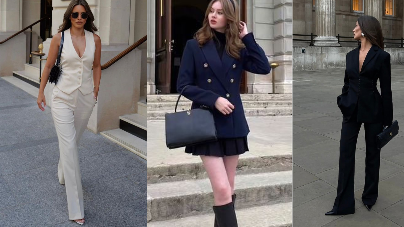 Trabalho ou reunião: camisa social branca ou azul clara + calça reta de alfaiataria + loafers ou scarpin neutro. Finalize com um blazer por cima ou jogado no ombro. Com isso você transmite elegância e profissionalismo sem esforço.