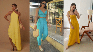 Se você ama cor, o verão pede paletas mais vivas. Azul-turquesa, fúcsia, amarelo-ouro e coral vão muito bem em vestidos, blusas ou biquínis (com saída de praia moderna, tipo uma camisa longa por cima). Combine uma peça vibrante com alguma peça neutra para equilibrar (ex: calça bege + regata coral). Mas não precisa ter medo de ousar: saia de estampa tropical + top verde + sandália laranja é a cara da estação. Só atenção às combinações muito contrastantes: às vezes escolher duas cores próximas (como laranja e pink) cria um look harmonioso e alegre, evitando aquele choque visual. Para completar, acessórios em palha, paletas inspiradas no pôr do sol (terracota e vinho claro) ou detalhes metalizados suaves (bronze, ouro velho) fazem composições elegantes.