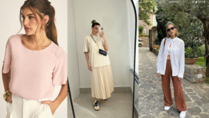 Camadas e sobreposições leves: mesmo no outono, escolho camadas finas. Um kimono de algodão, uma jaqueta jeans oversized ou um cardigan leve podem acompanhar blusas básicas. Essas sobreposições adicionam estilo sem me apertar – dá pra respirar e manter a elegância, seja em passeio ou no trabalho. Lenços de tecido fino no pescoço ou chapéus de palha também entram na lista de favoritos: completam o visual e trazem aquele frescor.