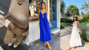 Shorts e bermudas confortáveis: em dias de verão intenso, nada melhor que um short de linho ou de malha leve. Os cortes soltos ou de cintura alta (com elástico) evitam aquela sensação de apertar a barriga. Eles são ótimos para passeios no parque ou praiana, acompanhados de uma camisa de botão aberta.