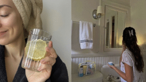 • Hidratação: À noite dá para usar um hidratante um pouco mais nutritivo ou até um óleo facial leve. Massageie nas bochechas, testa e pescoço. Esse toque gentil também relaxa.