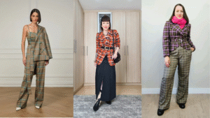 Outra tendência forte que está de volta é o uso de padronagens bem marcantes. O xadrez, por exemplo, apareceu em praticamente todas as coleções – da Balenciaga à Dior – como símbolo de atitude. Eu adoro um xadrez clássico (aquele tartan escocês, vermelho e preto) porque já transmite personalidade. Você pode jogar um casaco xadrez oversize sobre um look todo preto e pronto, um ar grunge chic. Ou misturar xadrez de cores diferentes em camadas para um mix divertido!