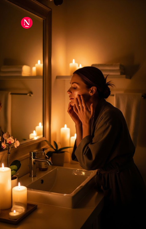 Segredo 2: Iluminação Baixa. Apago a luz principal e uso uma vela. O cérebro entende imediatamente: "é hora de desarmar".